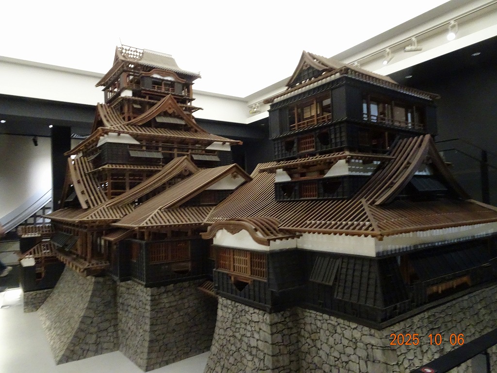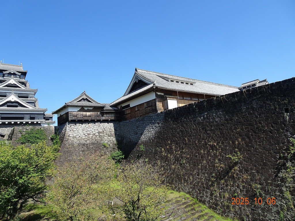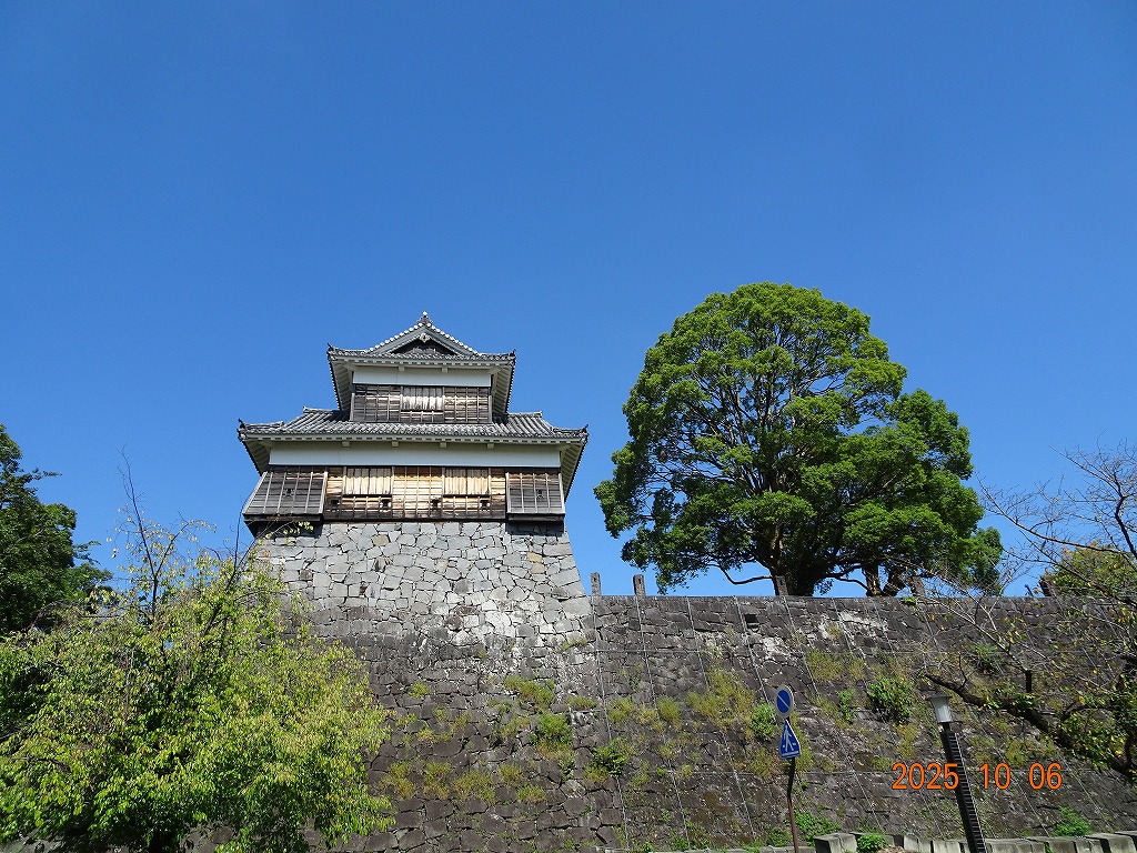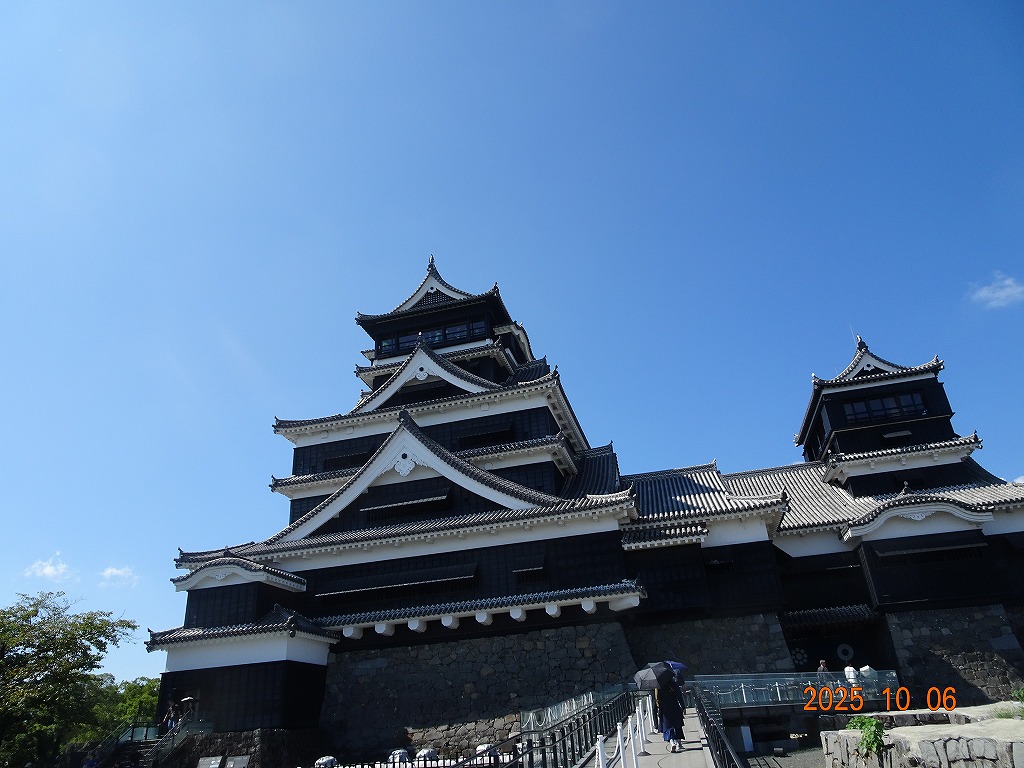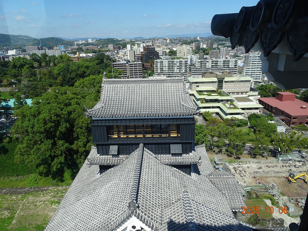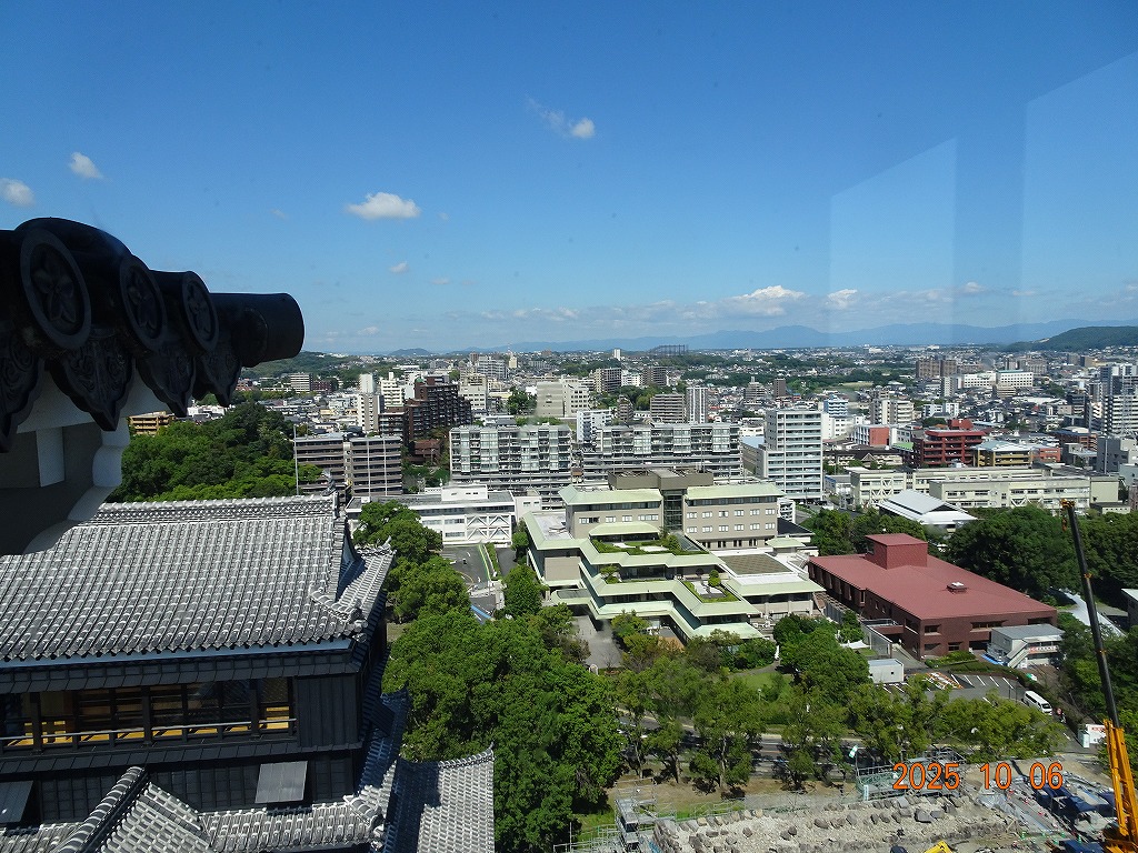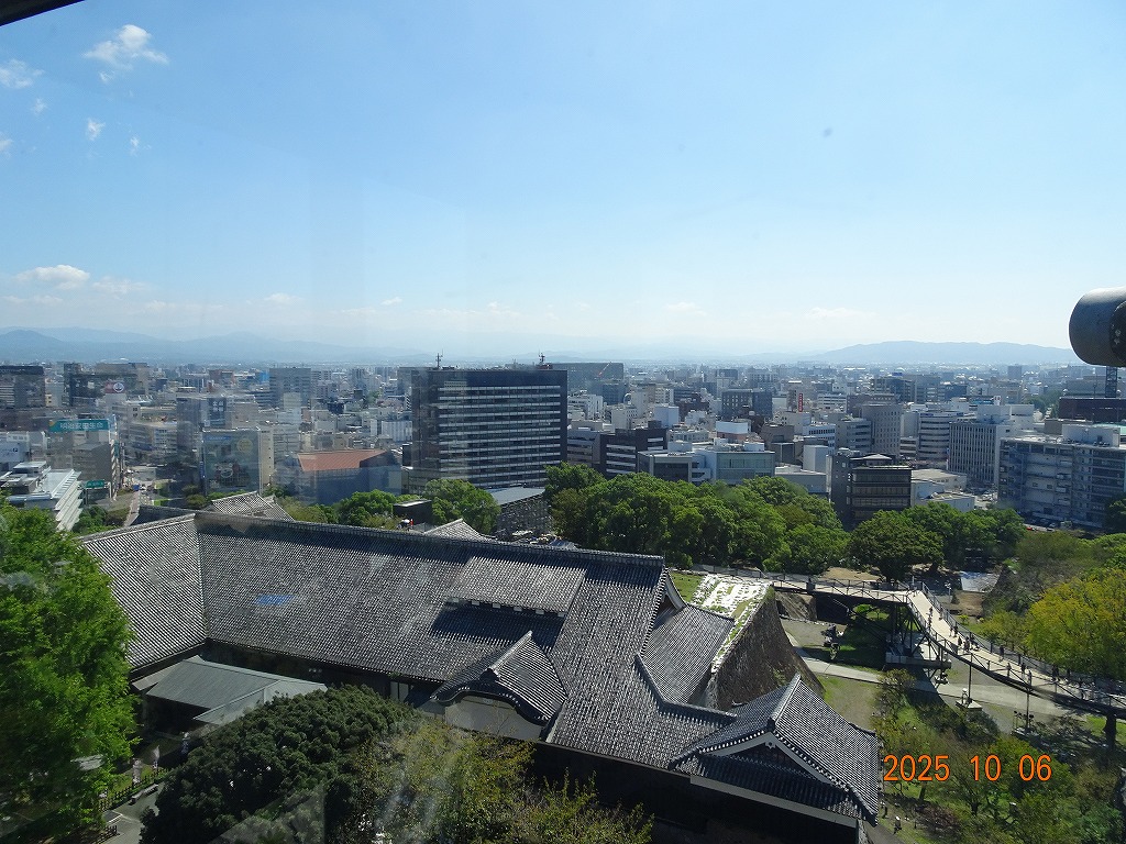 ○「熊本ホテルキャッスルから17年ぶりの熊本城見学-暑くて疲れました」の続きで、熊本城天守閣周辺写真です。令和7年10月6日(月)午後に熊本城に行きましたが、この日も気温は32,3度で真夏の暑さでした。私が熊本市に滞在した10月4~7日の6日間はズッと気温が30度以上で、熊本でさえ、10月の気温としては珍しいとのことでした。しかし、これからはこれが当たり前の気がします。 9.案内版に従い西出丸の前を通って本丸に向かいます ![]() 10.南東隅角部分の熊本地震で崩落した石垣を見ながらさらに本丸に向かいます ![]() 11.歩くこと数分でようやく天守閣に到着、17年前の記憶は余りありません ![]() 12.天守閣に上ります ![]() 13.豊臣秀吉の加藤清正に対する肥後国を与えるとの文書が展示されていました ![]() 14.天守閣の模型がありました ![]() 15.しゃちほこ模型と熊本地震での天守閣前石垣崩落状況を再現した模型 ![]() 16.天守閣最上階からの熊本の街の眺め、ホテルキャッスルも見えます ![]() 以上:461文字