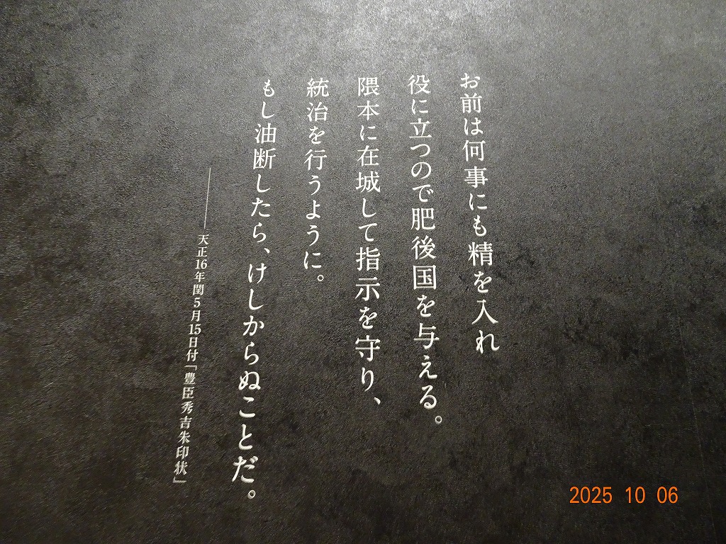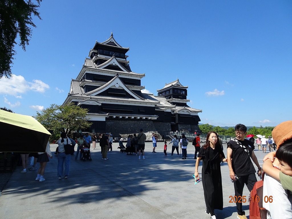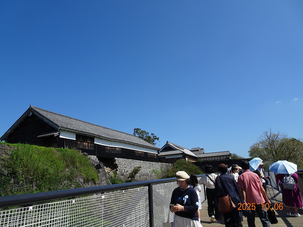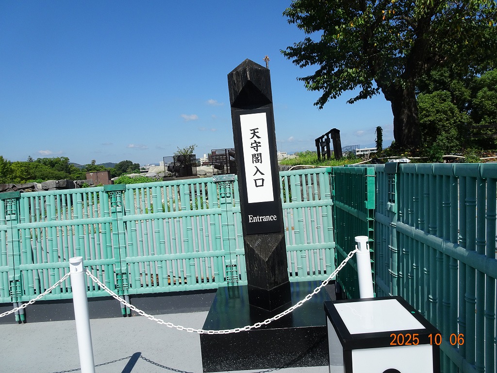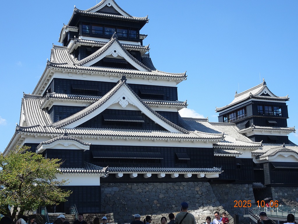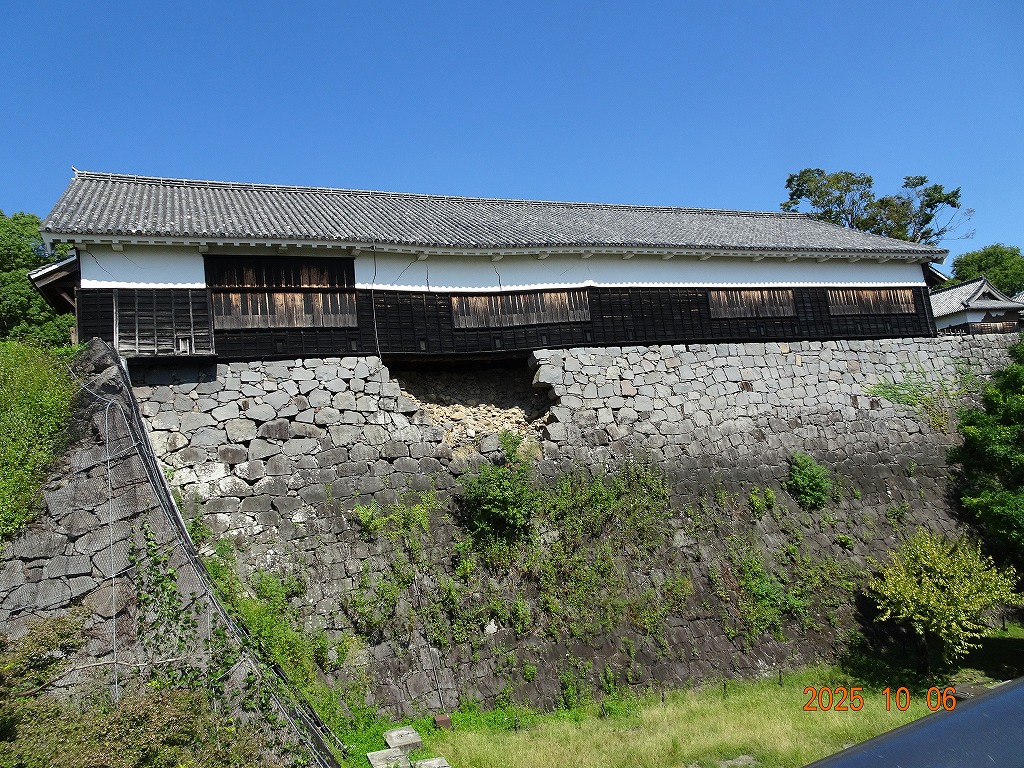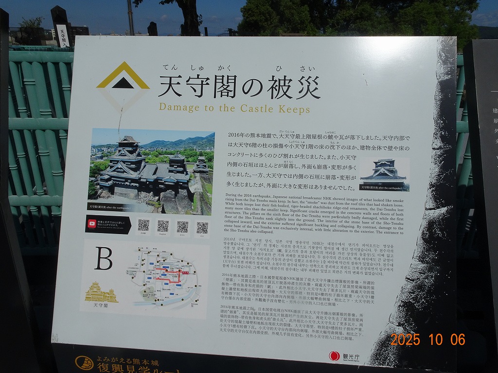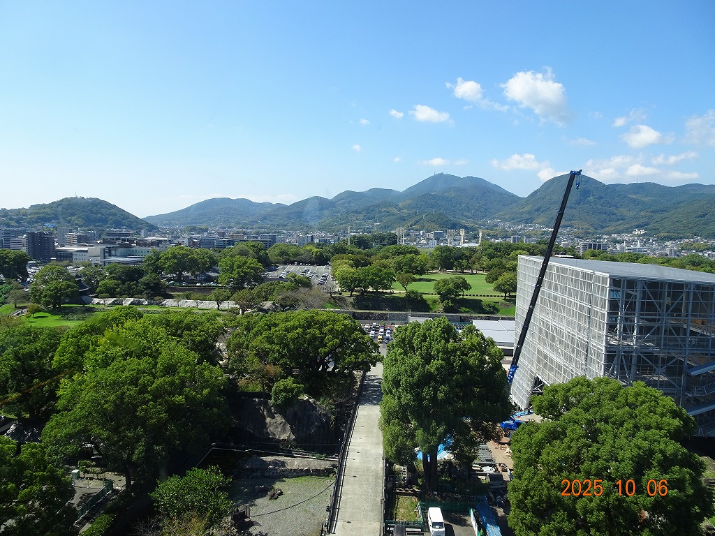 ○「熊本ホテルキャッスルから17年ぶりの熊本城見学-暑くて疲れました」の続きで、熊本城天守閣周辺写真です。令和7年10月6日(月)午後に熊本城に行きましたが、この日も気温は32,3度で真夏の暑さでした。私が熊本市に滞在した10月4~7日の6日間はズッと気温が30度以上で、熊本でさえ、10月の気温としては珍しいとのことでした。しかし、これからはこれが当たり前の気がします。 9.案内版に従い西出丸の前を通って本丸に向かいます ![]() 10.南東隅角部分の熊本地震で崩落した石垣を見ながらさらに本丸に向かいます ![]() 11.歩くこと数分でようやく天守閣に到着、17年前の記憶は余りありません ![]() 12.天守閣に上ります ![]() 13.豊臣秀吉の加藤清正に対する肥後国を与えるとの文書が展示されていました ![]() 14.天守閣の模型がありました ![]() 15.しゃちほこ模型と熊本地震での天守閣前石垣崩落状況を再現した模型 ![]() 16.天守閣最上階からの熊本の街の眺め、ホテルキャッスルも見えます ![]() 以上:461文字