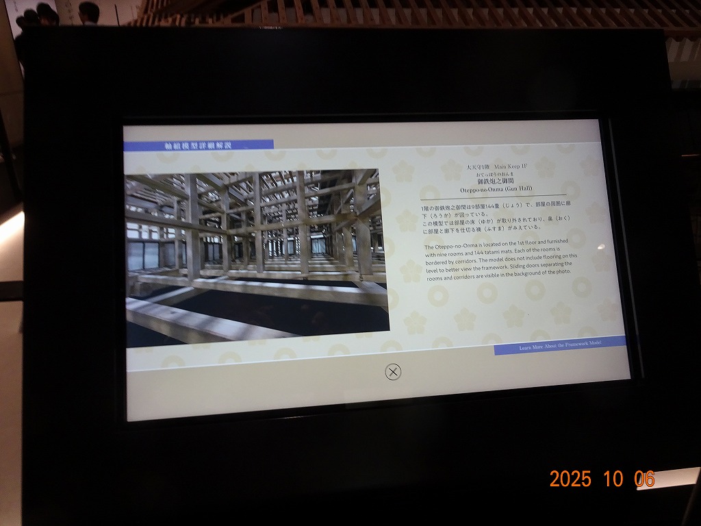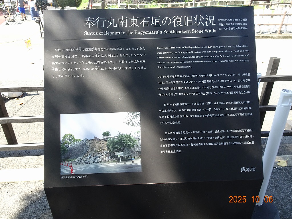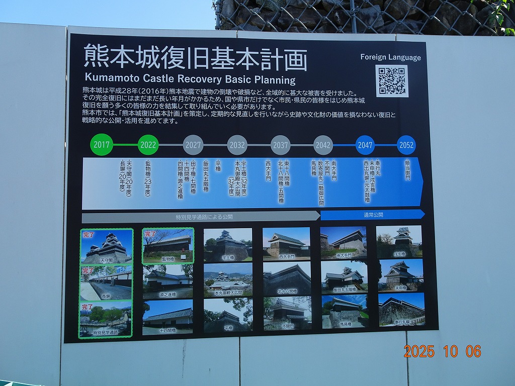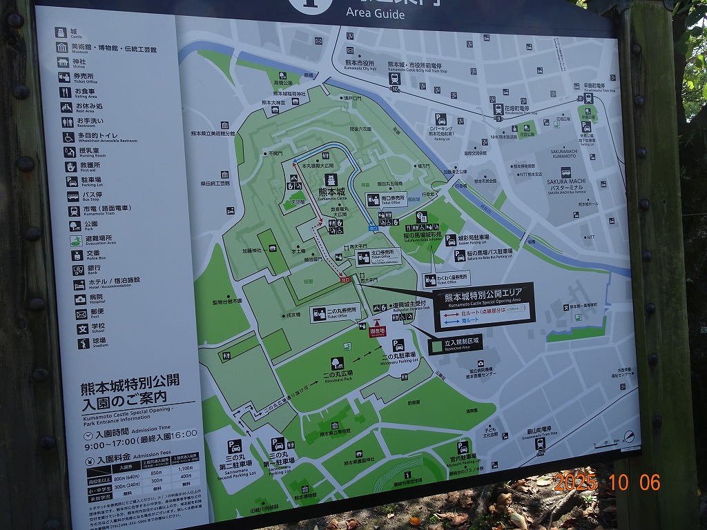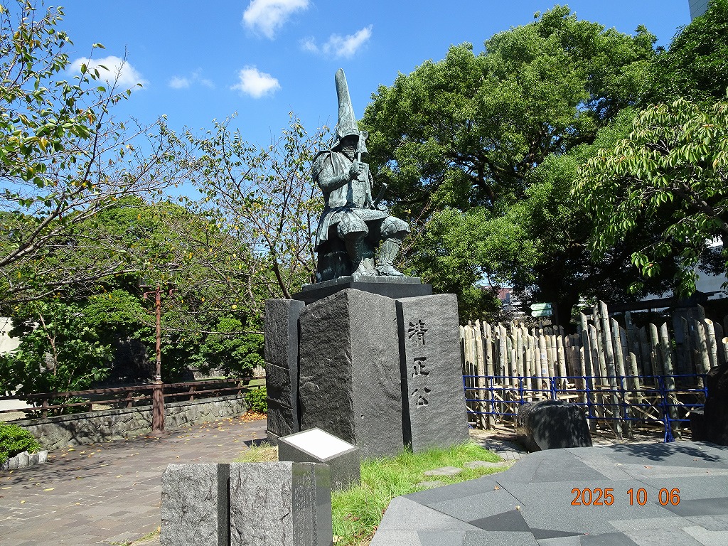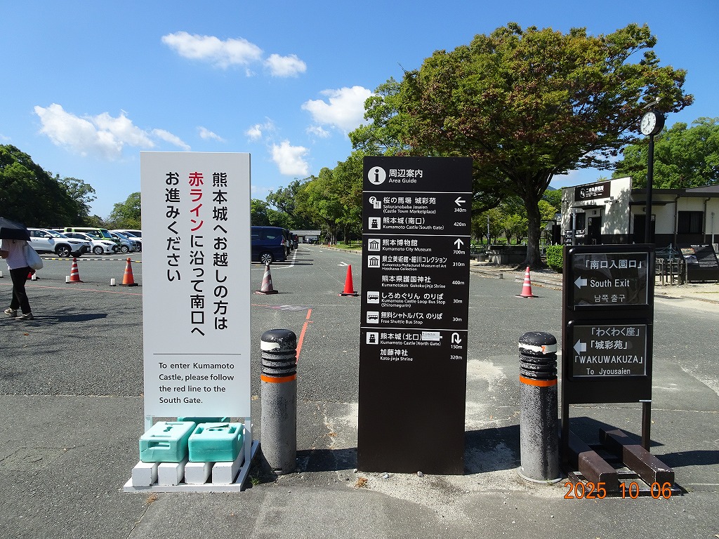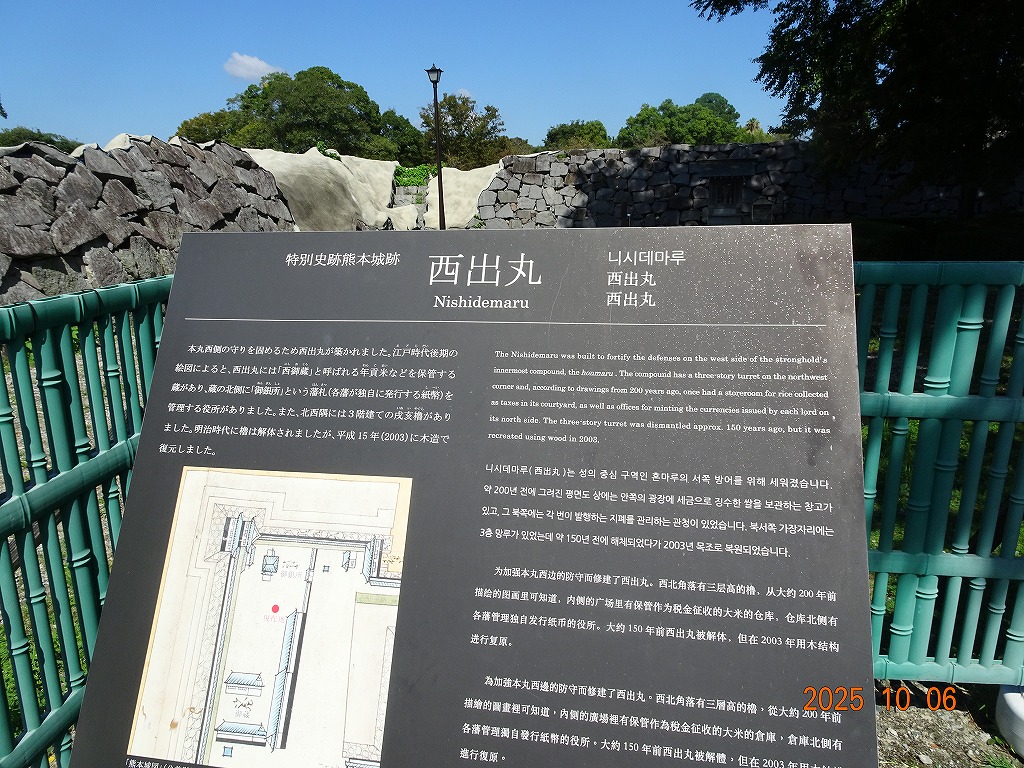 ○「熊本ホテルキャッスルから17年ぶりの熊本城見学-暑くて疲れました」の続きで、熊本城天守閣周辺写真です。令和7年10月6日(月)午後に熊本城に行きましたが、この日も気温は32,3度で真夏の暑さでした。私が熊本市に滞在した10月4~7日の6日間はズッと気温が30度以上で、熊本でさえ、10月の気温としては珍しいとのことでした。しかし、これからはこれが当たり前の気がします。 9.案内版に従い西出丸の前を通って本丸に向かいます ![]() 10.南東隅角部分の熊本地震で崩落した石垣を見ながらさらに本丸に向かいます ![]() 11.歩くこと数分でようやく天守閣に到着、17年前の記憶は余りありません ![]() 12.天守閣に上ります ![]() 13.豊臣秀吉の加藤清正に対する肥後国を与えるとの文書が展示されていました ![]() 14.天守閣の模型がありました ![]() 15.しゃちほこ模型と熊本地震での天守閣前石垣崩落状況を再現した模型 ![]() 16.天守閣最上階からの熊本の街の眺め、ホテルキャッスルも見えます ![]() 以上:461文字